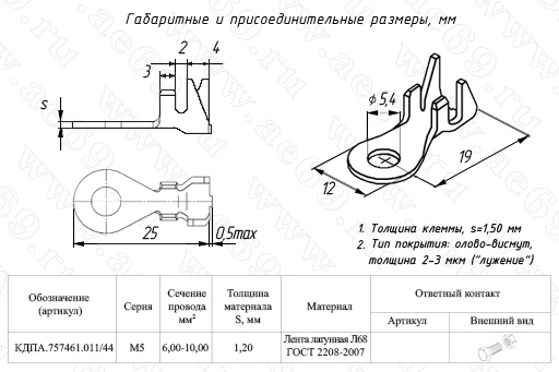 Клемма "под болт" М 5 (усилен.s=1,2мм, под провод от 6,00 до 10,00 мм кв., лужен.) мин.100шт